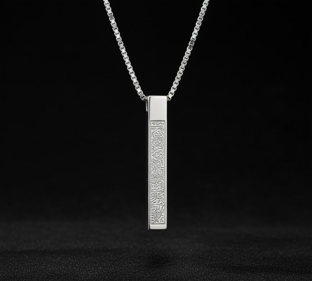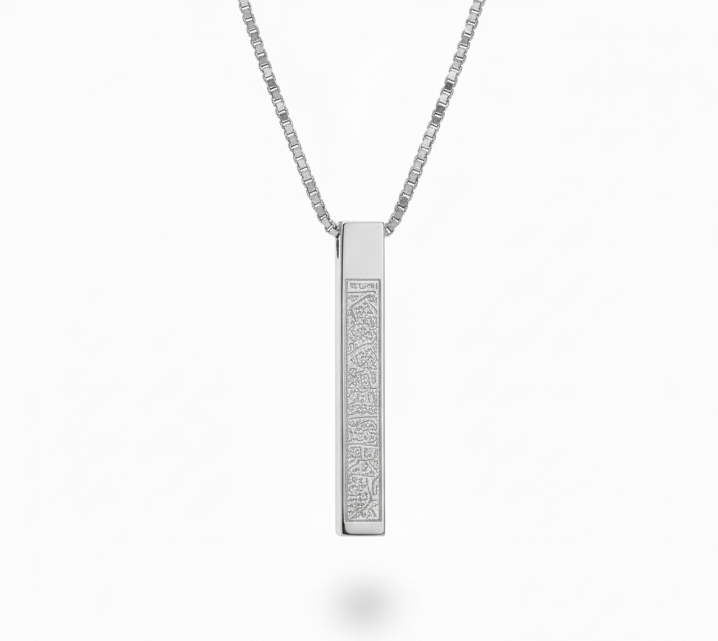 Minimal ve modern çizgilerle tasarlanmış Ayet-el Kürsi Çubuk Kolye, klasik koleksiyonun zarafetini yeniden yorumluyor. İnce ve dikdörtgen çubuk formu, kolyenizi hem şık hem de anlam dolu bir aksesuar haline getiriyor.