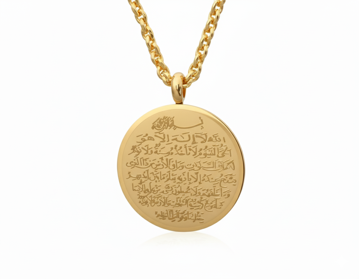 Eşsiz tasarımıyla zarafeti yansıtan bu kolye, üzerinde yer alan Ayet-el Kürsi motifi sayesinde sadece estetik değil, aynı zamanda manevi bir anlam taşır.